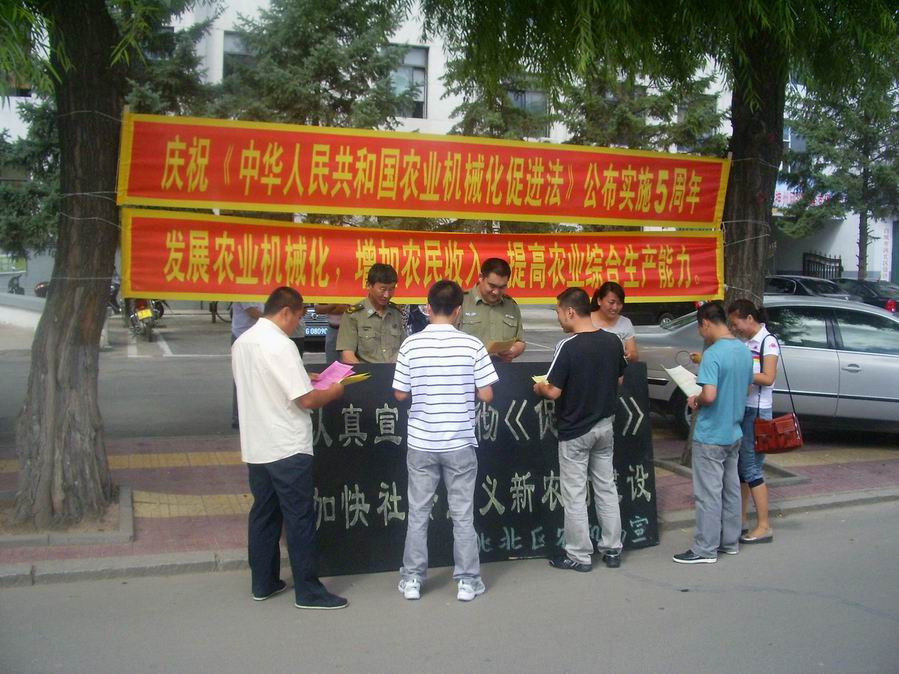 今年是《中华人民共和国农业机械化促进法》公布实施五周年,为进一步推动《促进法》深入贯彻实施,促进我省农业机械化又好又快发展,按照农业部及省里的有关文件要求,7月25日,白城市农委及洮北区农机管理总站联合进行了《中华人民共和国农业机械化促进法》公布实施五周年宣传庆祝活动。在此期间,还将通过调查问卷,召开座谈会等多形式进行纪念庆祝活动。