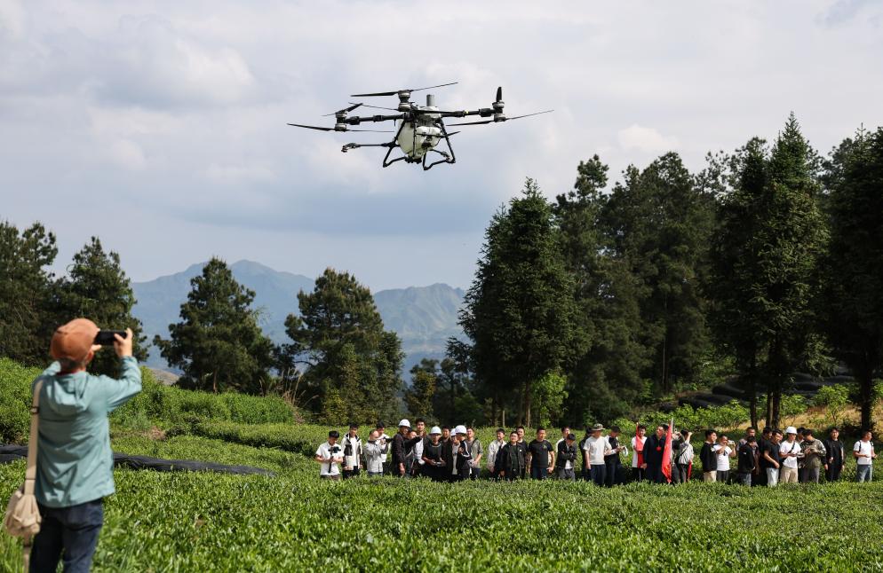 4月17日,2026年贵州省山地特色高效农业无人机应用(农作物植保)培训班在贵州省黔南布依族苗族自治州都匀市开展实训。图为学员在贵州省黔南布依族苗族自治州都匀市匀东镇摆茶村抹茶种植基地学习农业无人机茶园飞防实操技术。(新华社记者 杨文斌 摄)