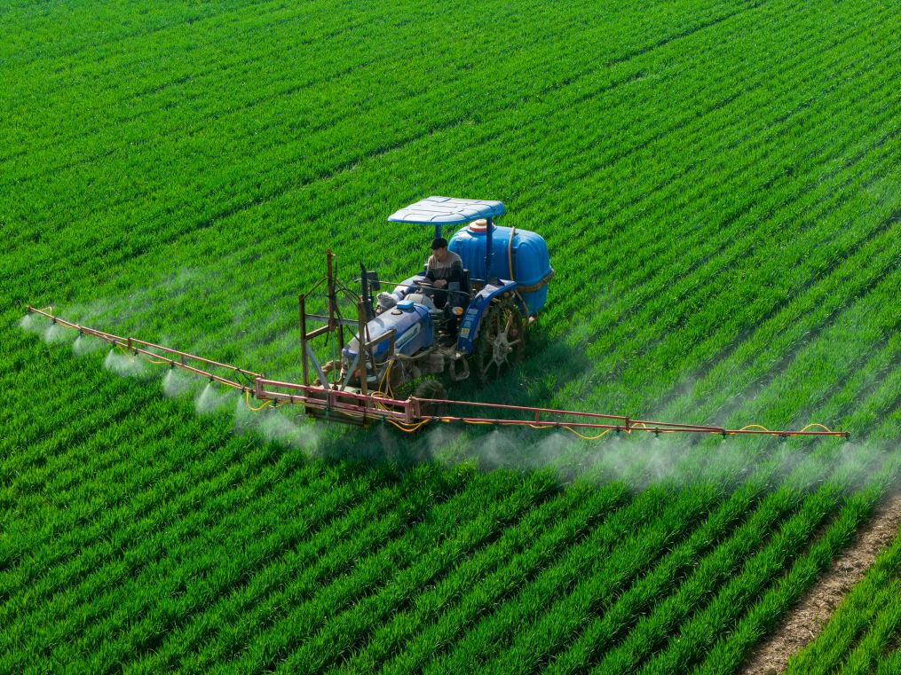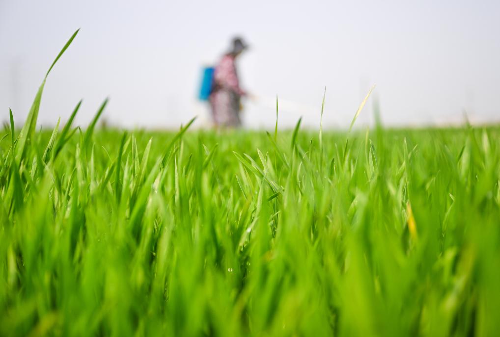 3月20日,在河南省商丘市夏邑县曹集街道刘枣园村,村民在麦田内开展“一喷三防”作业。新华社发(王高超摄) |